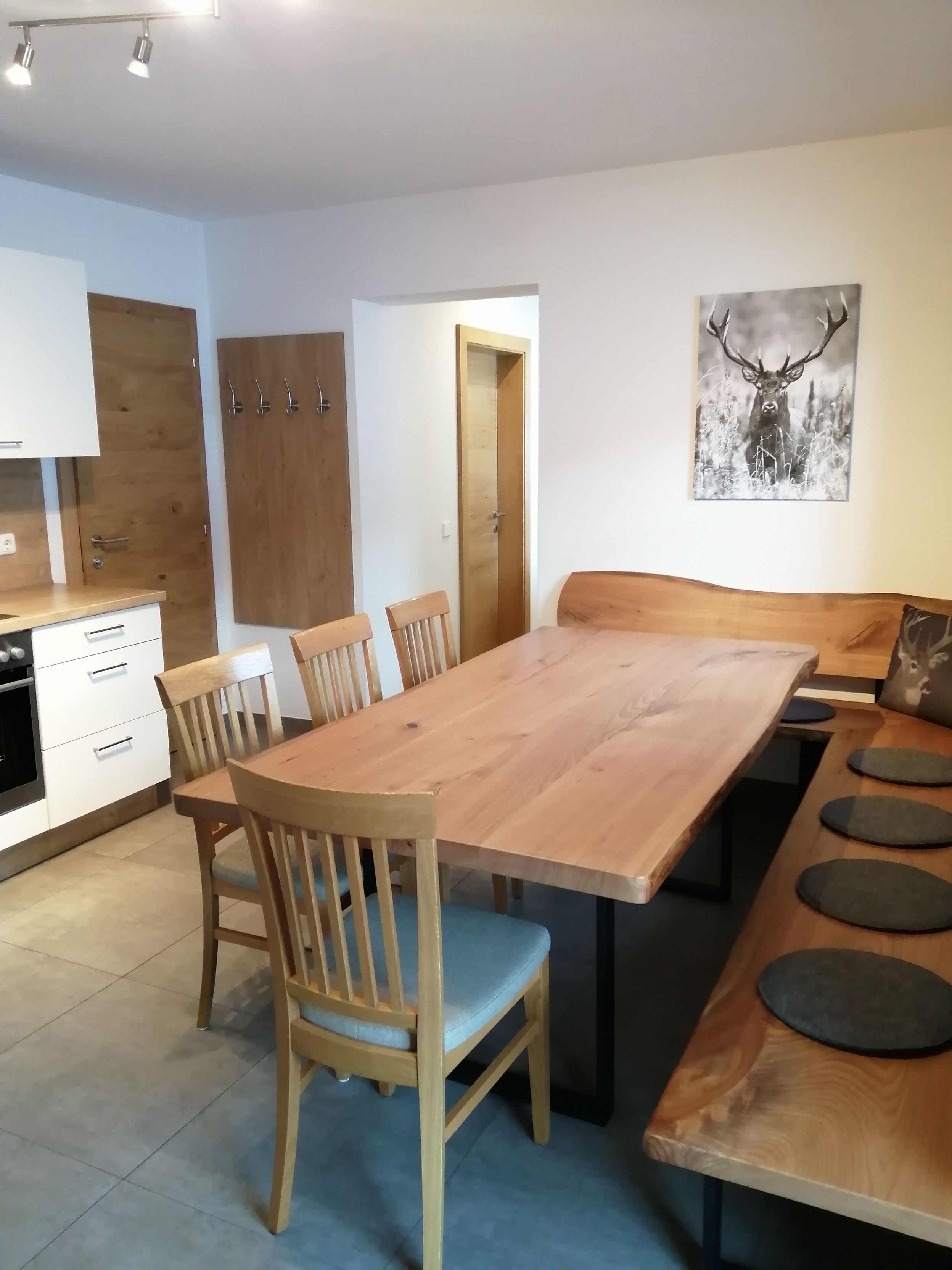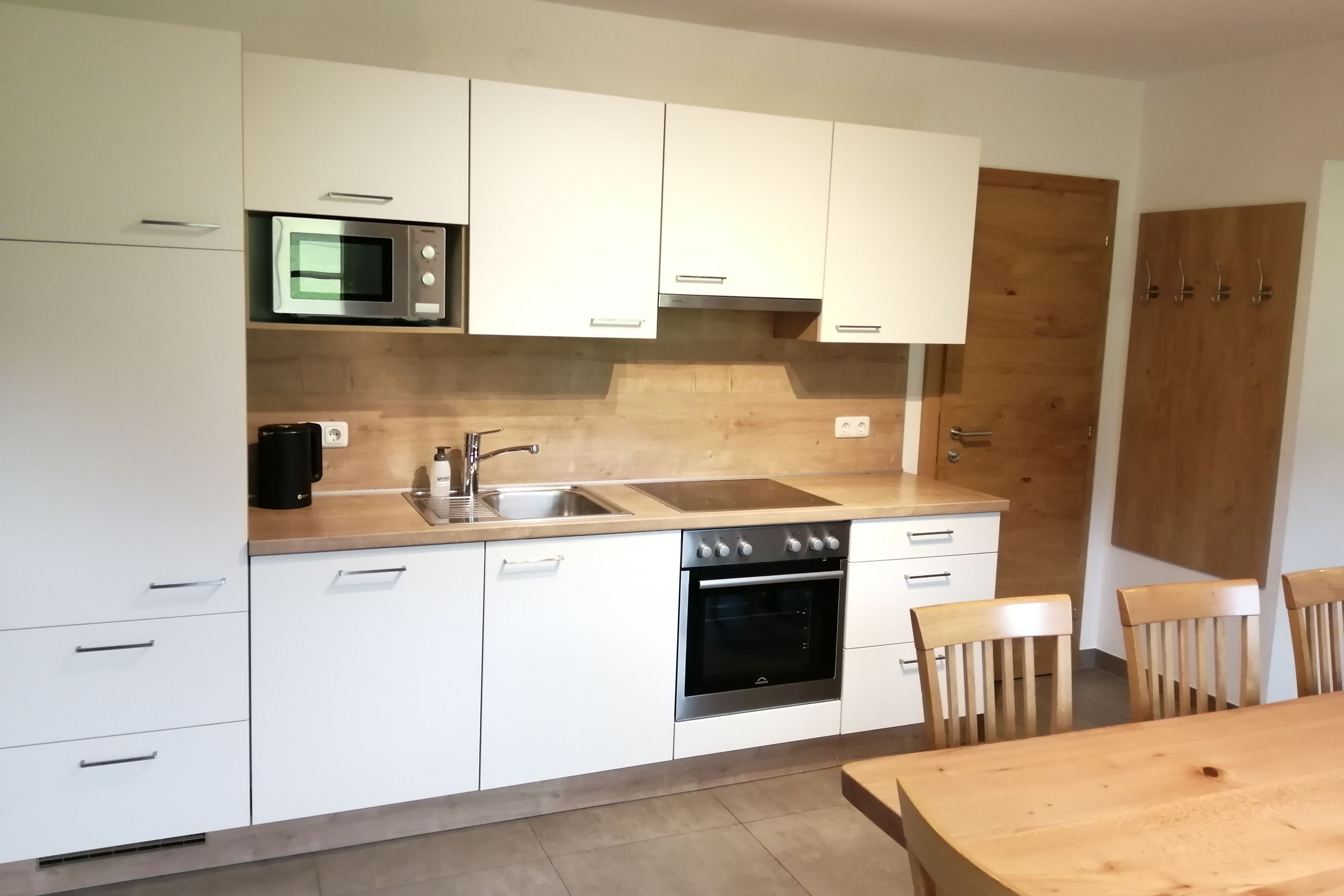 - Die Wohnung verfügt über einen Küchenblock mit 4 Cerankochfeldern inkl. Backofen, Geschirrspüler, Kühlschrank mit Gefrierfach, Mikrowelle, Wasserkocher, Toaster, Kaffeemaschine, Esstisch mit Eckbank, Garderobe, Geschirr und TV-Gerät.