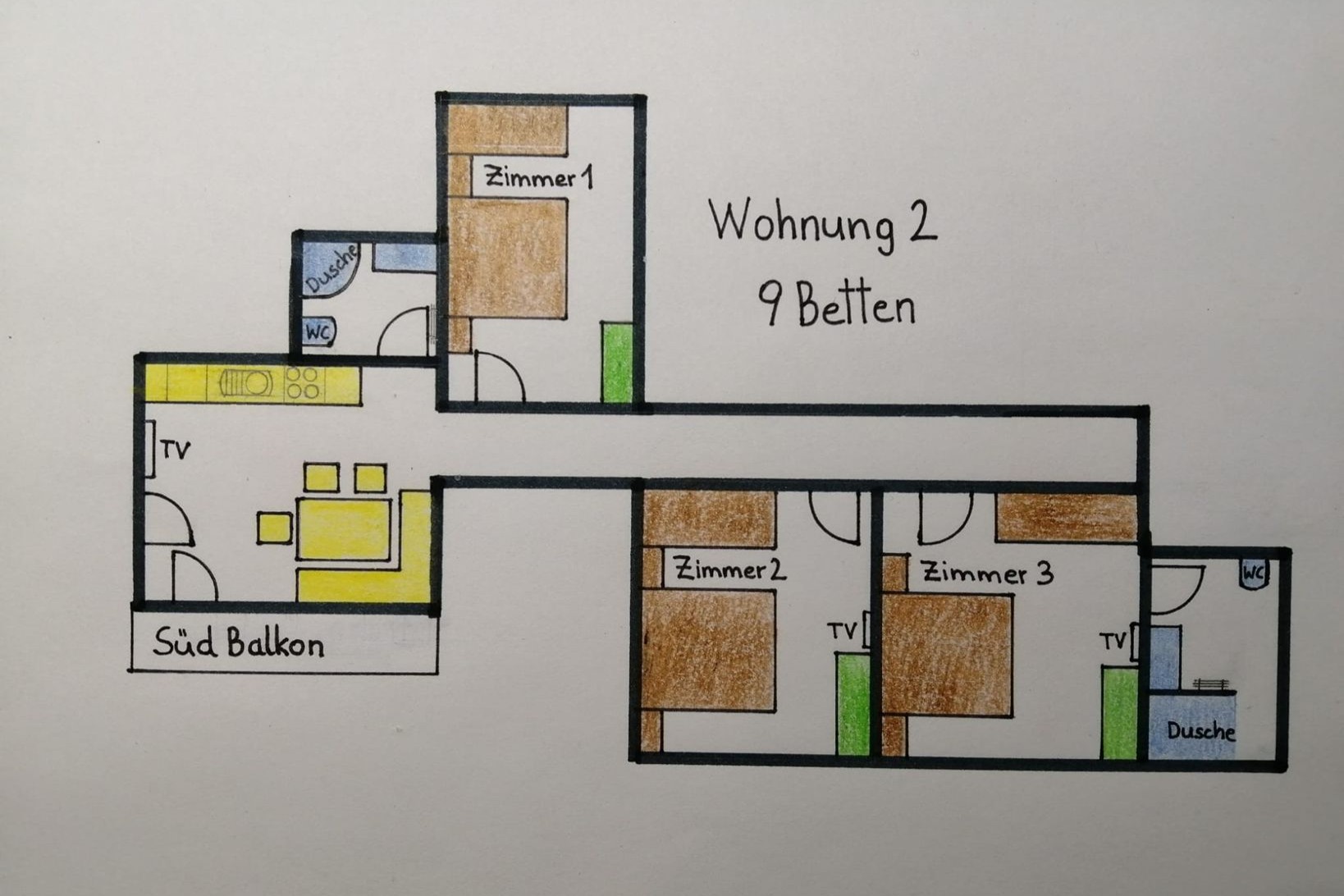 - 3 Doppelzimmer mit jeweils einem Zusatzbett (in 2 der Zimmer befindet sich ein TV-Gerät)
